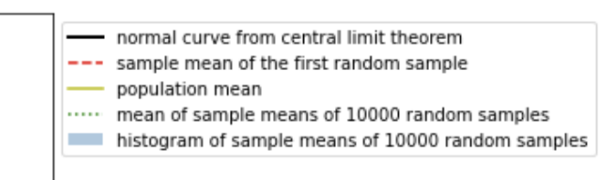 plt.axvline(x=samples_mean, color='g', linestyle=':', label='mean of sample means of 10000 random samples')