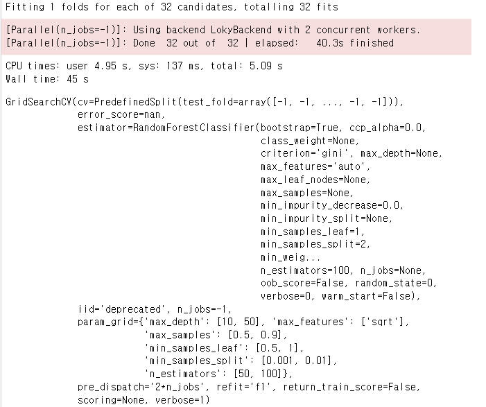 GridSearchCV로 랜덤포레스트 모델의 하이퍼파라미터 튜닝을 수행하는 코드이다.