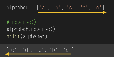 | reverse() | Reverses the order of the list | 리스트 내 요소 순서를 단순하게 뒤집기 | list.reverse() |