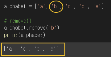 | remove() | Removes the first item with the specified value | 특정 요소 지우기 (여러 개라면 가장 첫 순서에 있는) |