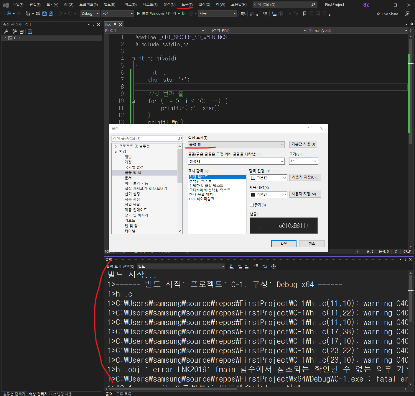 visual studio 비주얼 스튜디오 출력창 글씨 크기 키우기